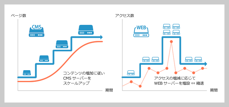 DB サーバーが不要で静的配信型の WebRelease は、クラウド上での運用に適しています。クラウドを採用すればサーバーの選定や調達・インフラの構築は不要になり、初期費用を抑えて導入期間も短縮することができ、導入後もサーバーやネットワークの保守・運用をアウトソーシングできます。
